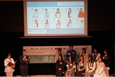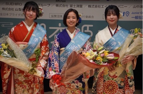 今回、県内外の18歳から55歳までの男女45人からの応募があり、こうふ亀屋座で開催した審査会には、書類審査などを経て二次審査に進出した10人が志望動機や山梨への思いを語ったほか、バレエやキーボード演奏などおのおのの特技を披露し、表現力や発信力をアピールしました。その後、最終審査に進んだファイナリスト3人は、きものあさ川様からご協賛いただき、ご用意いただいた色鮮やかな着物姿で登場し、「あいうえお作文」や「一問一答チャレンジ」などアドリブ力を試す審査や、甲州印伝の商品をPRする課題に挑戦するなど、山梨の魅力や湖衣姫への想いを自らの言葉で伝えました。