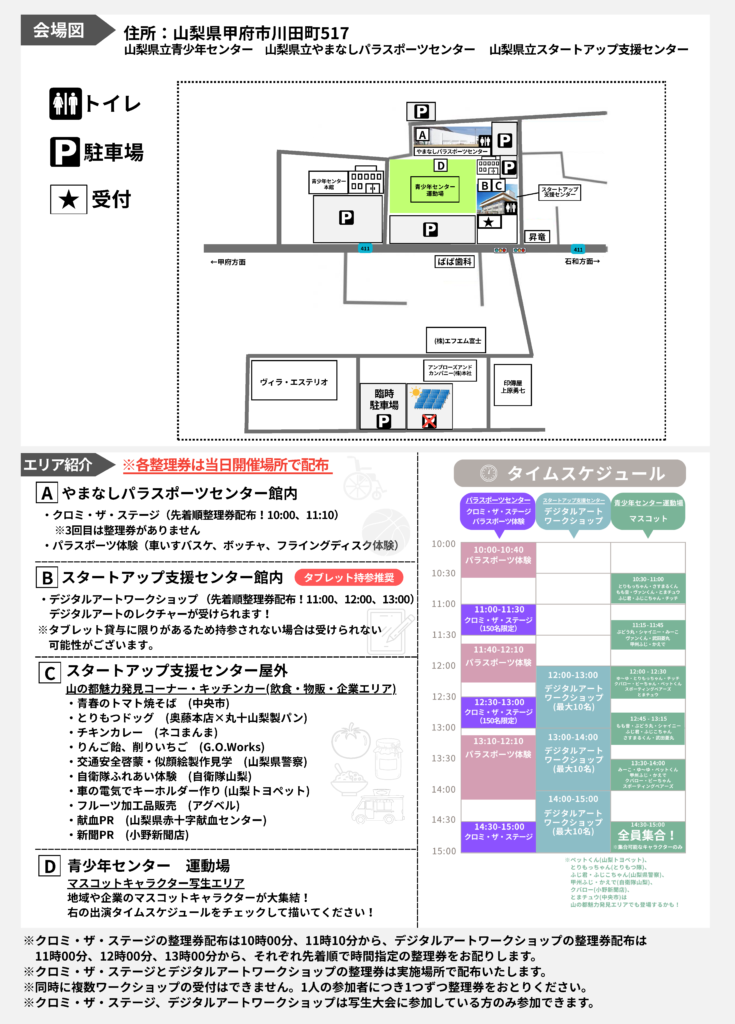 ⽇ 時:2026年5⽉16⽇(⼟)10時00分〜15時00分(受付9時30分〜)※⾬天時も同⽇開催会 場:⼭梨県⽴⻘少年センター 運動場