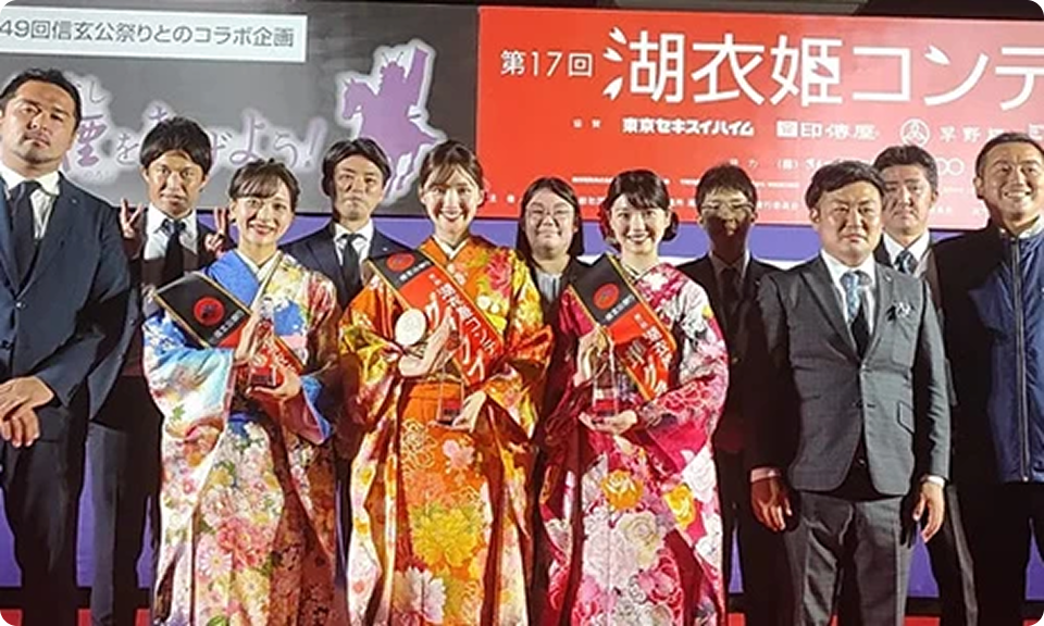 武田信玄公の側室であり、武田勝頼の生母である湖衣姫(諏訪御料人)になぞらえ、18歳以上の女性を対象とした信玄公祭り前夜祭として開催されるコンテストです。グランプリ1名、準グランプリ2名は翌日の「甲州軍団出陣」にて「湖衣姫隊」として出陣し、その年の1年間、山梨県の観光大使として活動していただくことが通例となっています。2002年に甲府青年会議所が発案し、現在も主催しています。