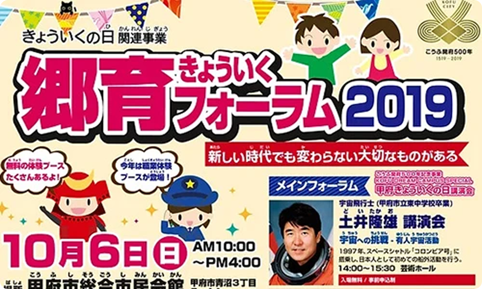 大人は子どもを思いやり、子どもに地域の伝統や文化、そして本来あるべき親の姿を継承して行ける故郷(ふるさと)になることを目指し、子どもばかりか我々大人一人ひとりが自ら学び、地域を育むため、甲府市、中央市、甲斐市、昭和町とともに「きょういくの日」制定事業としておこなわれています。甲府青年会議所が2007年に作り上げた事業です。